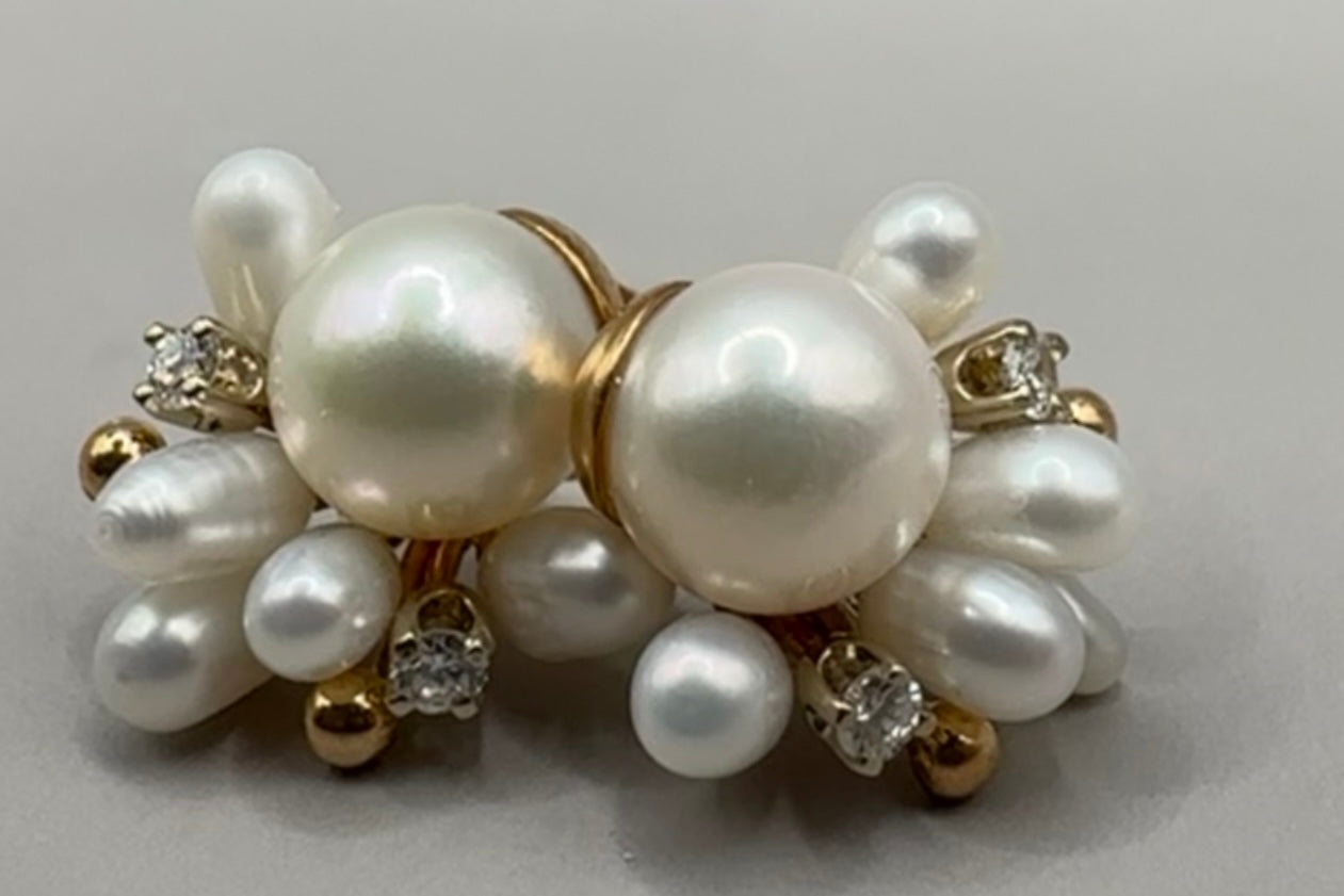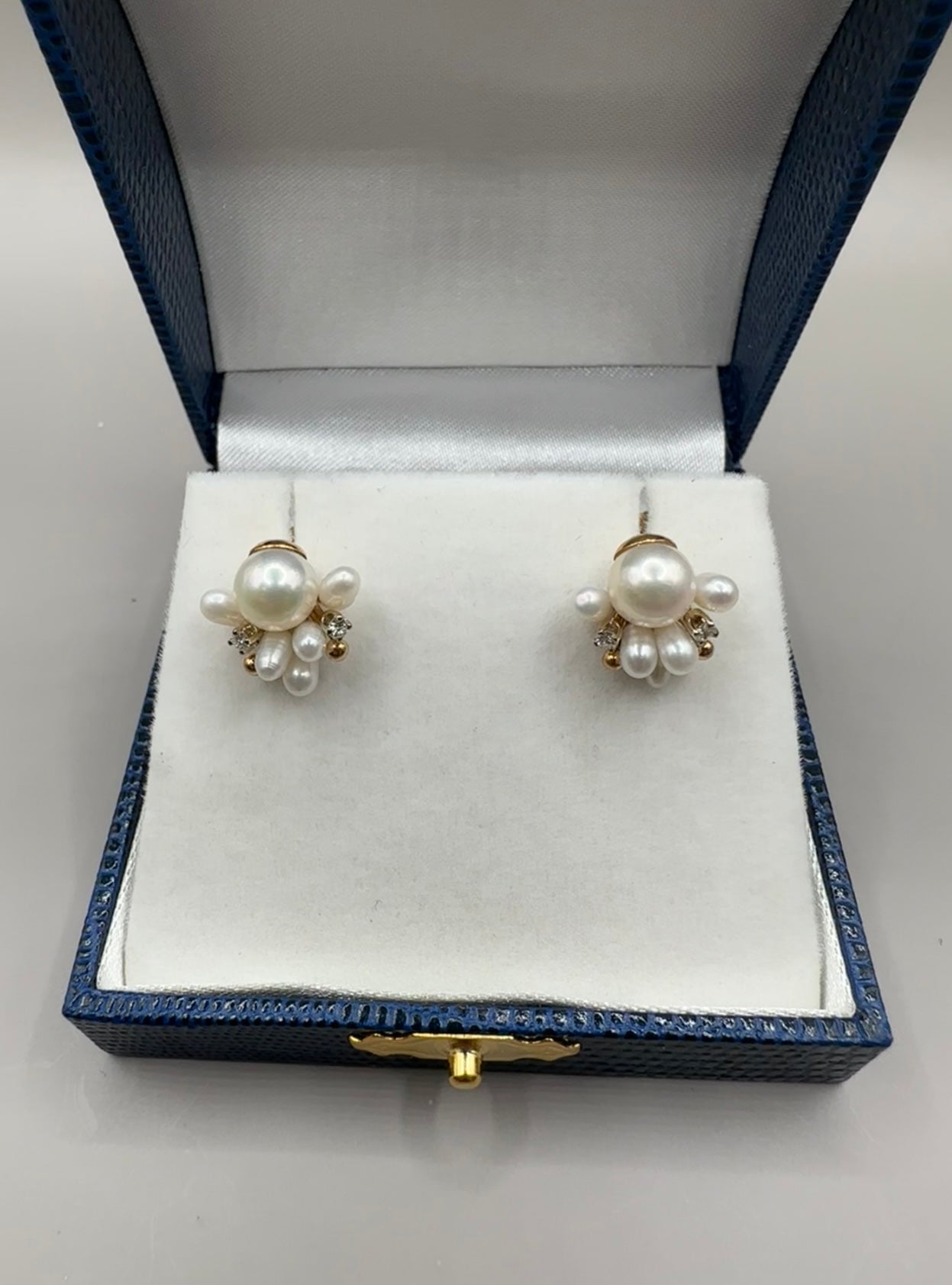 Cluster of Pearl and Diamond Studded Yellow Gold Earrings